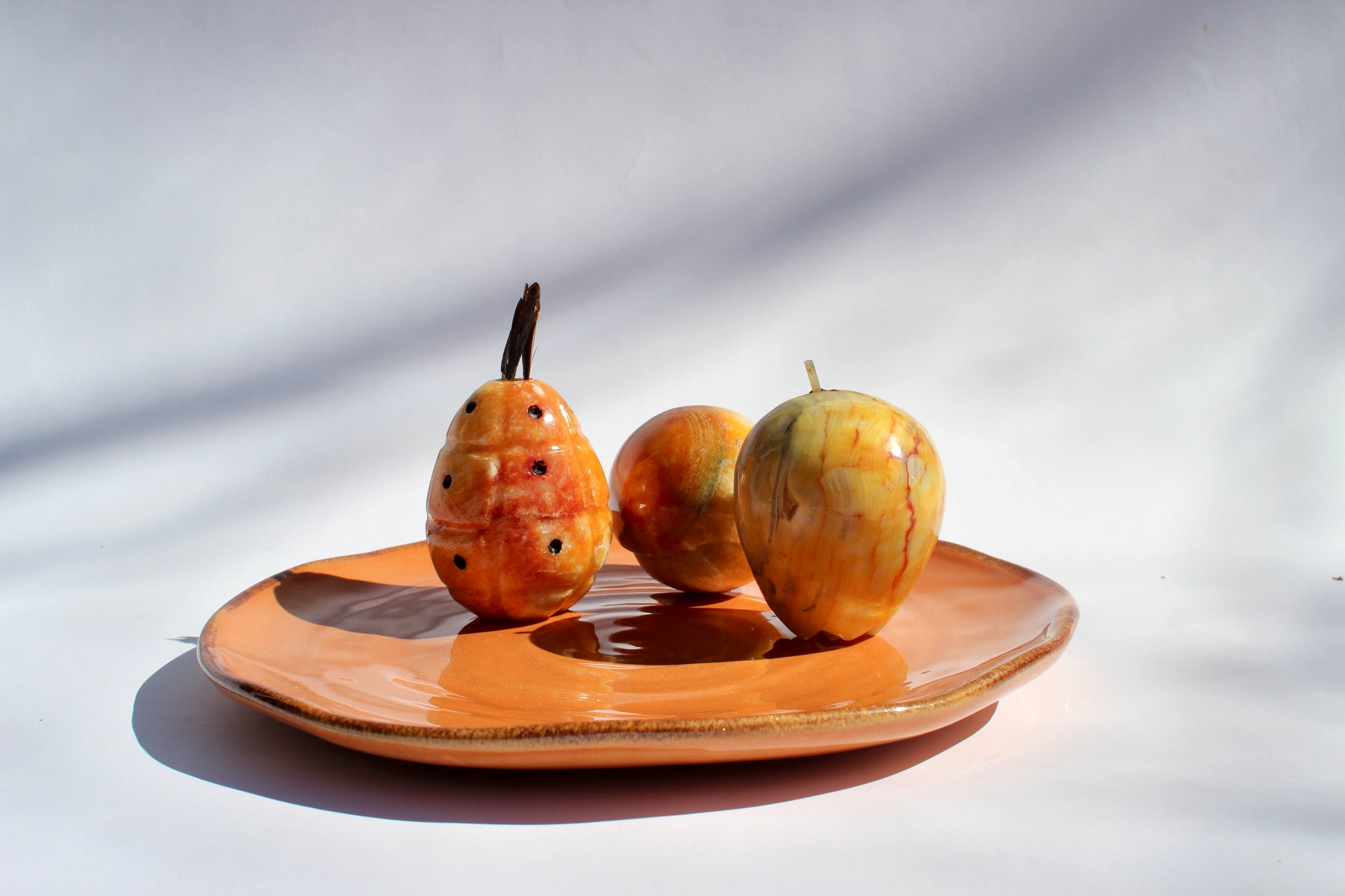 This ceramic plate features an handmade organic shape and glossy pumpkin glaze with a slightly deeper rim detail. Marked ITALY at base.