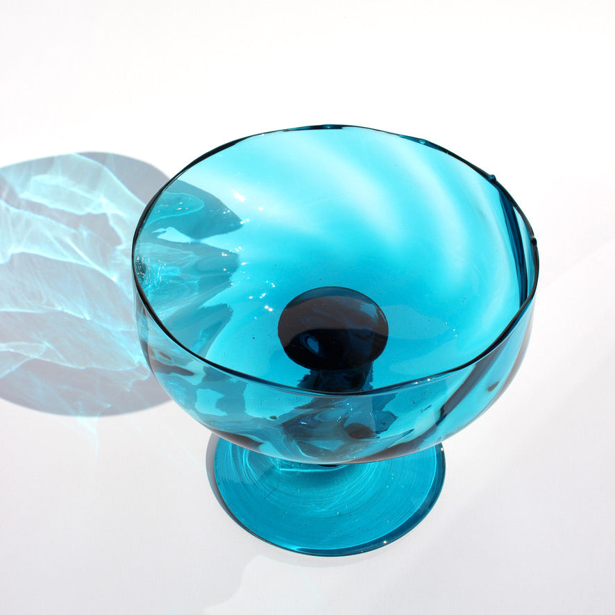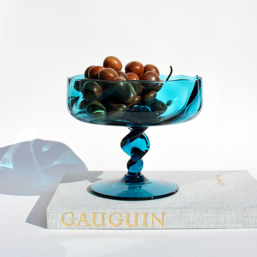It's hard to decide which is better: The gorgeous hand-twisted stem, or the vibrant peacock blue hue of this Empoli Italian glass dish. The large format makes it extra special, and we love the little inclusions and imperfections, a sign of hand-blown art glass.
