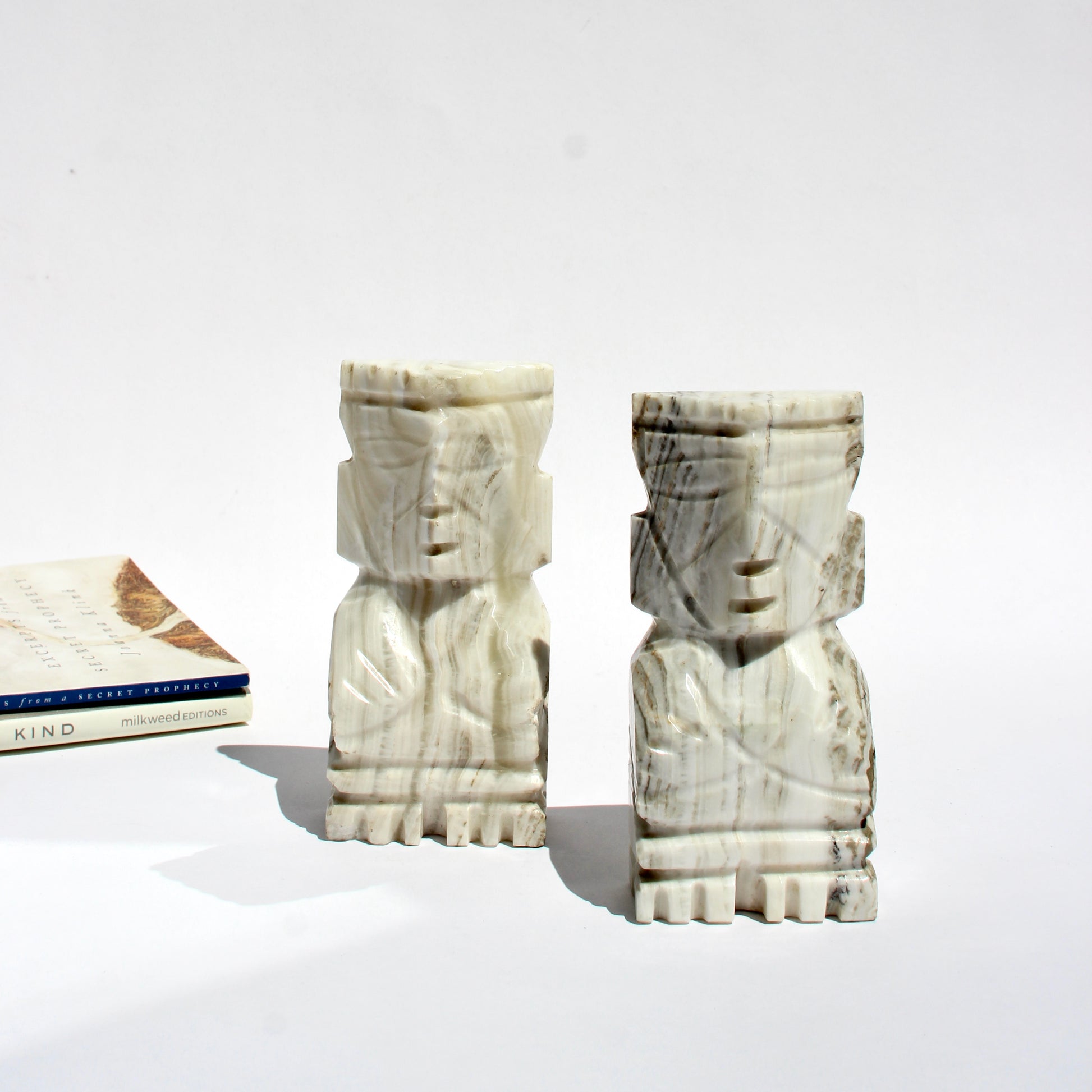 Carved from solid marble, these midcentury bookends reinterpret Aztec-inspired figures with modernist geometry and subtle natural veining. Their cool stone surfaces and sculpted lines bring both grounding weight and visual intrigue to any shelf or console. A distinctive pair that brings personality to modern design—timeless, functional art for the well-collected home.